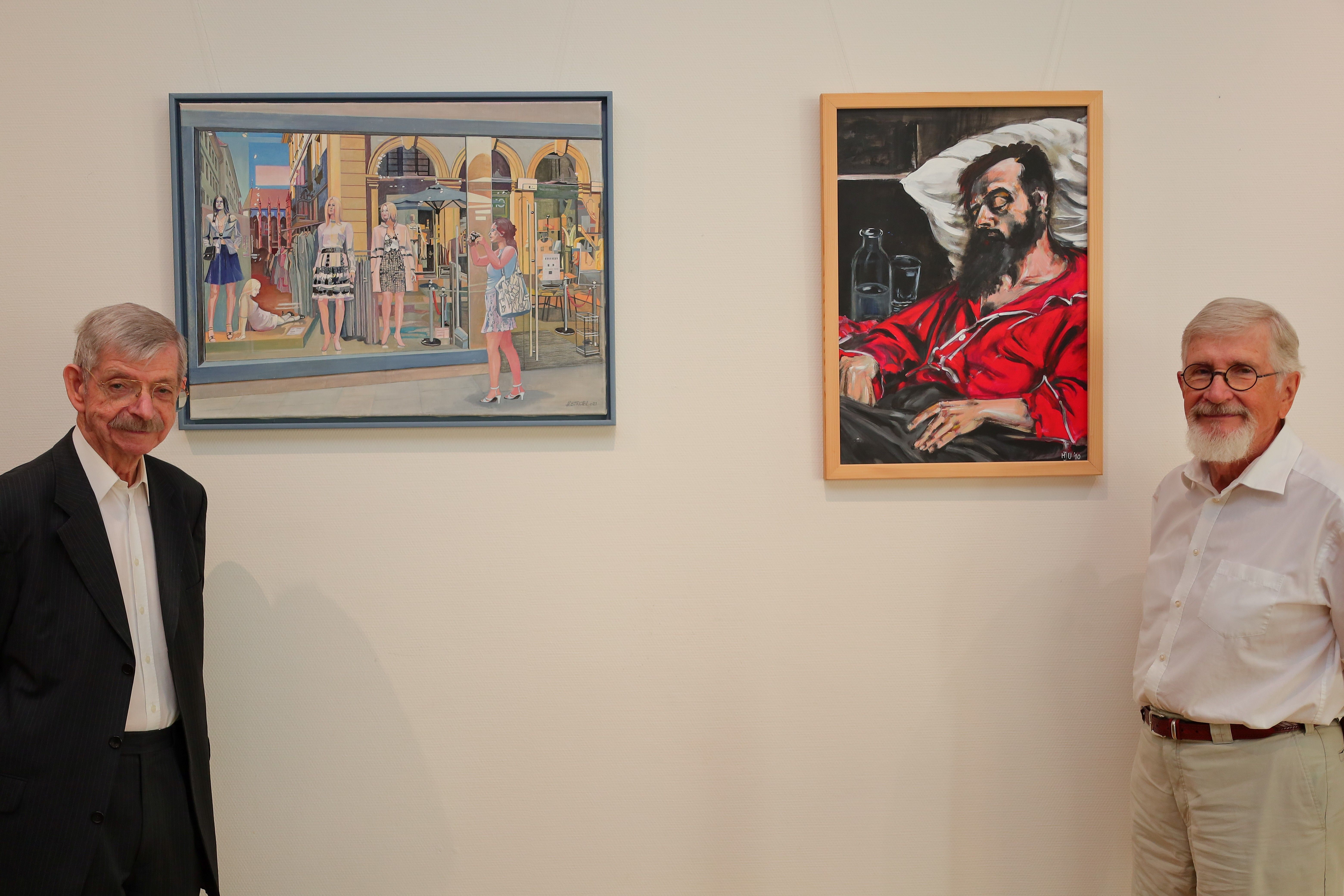 Zwischen Gelassenheit und Mut, zwischen Hinnahme und Veränderung – genau in diesem spannungsvollen „Dazwischen“ bewegt sich die Kunst von Hermann Strobl und Hans-Jürgen Schreckling. Ihre Werke stellen Fragen, wo Antworten schnell gefunden scheinen. Sie laden ein, innezuhalten, wo wir gewohnt sind, im Alltag vorbeizueilen. Sie öffnen Räume, in denen das Menschliche in seiner Schönheit, aber auch in seiner Zerbrechlichkeit sichtbar wird.Kolping steht für Menschlichkeit, für Weitblick und gegen Intoleranz. Diese Haltung findet in den Bildern der beiden Künstler eine eindrucksvolle Entsprechung: Ästhetik trifft auf Fürsorge, Linien auf Farben, Fantasie auf Erfahrung mit Leid und Hoffnung. So entstehen Werke, die weder bloß abbilden noch belehren, sondern das „Dazwischen“ spürbar machen – das Offene, Fragende, Suchende.